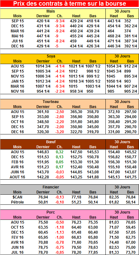 Fermeture faible sur les grains aujourd’hui et également sur le prix des autres matières premières. Un élément important à souligner est la vigueur du dollar américain cette semaine qui est négatif pour le prix des commodités. Les bulletins météo annoncent aussi sur le long terme du temps plus sec dans le « corn belt » qui devrait fortement aider le maïs et le soya. Il ne faut pas oublier que la qualité du maïs est restée stable en moyenne depuis les deux dernières semaines et que le marché restait haut en anticipation de fortes pluies à venir.
