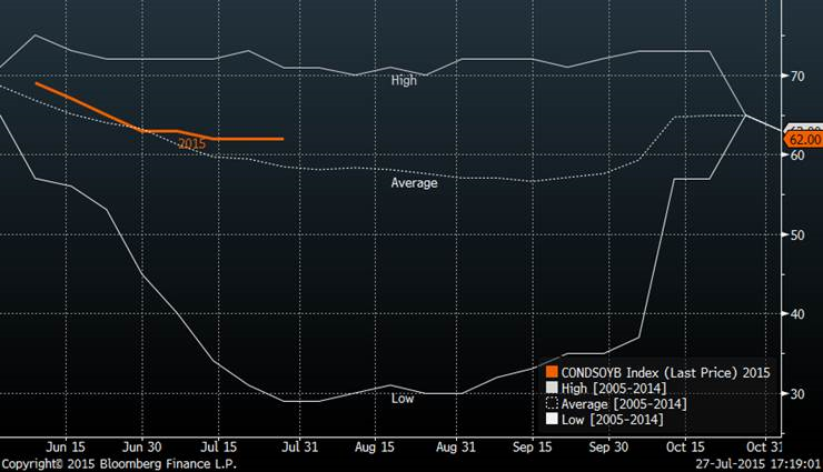 La baisse de 8% de la bourse chinoise aujourd’hui a été un des principaux éléments expliquant la forte correction du prix des grains en plus des bulletins météo favorables en moyenne pour les cultures. Le soya reste cependant à 62% bon ou excellent et pour l’instant on est encore sous les niveaux de 2009 et 2010 quand le rendement moyen était de 43.8 boisseaux à l’acre. Le rendement estimé de la USDA de 46 boisseaux à l’acre est possiblement trop élevé pour cette année. 2 boisseaux de moins à l’acre et les inventaires de fin pourraient potentiellement baisser à 250 millions de boisseaux si la demande reste forte…(à suivre en partie avec les ventes à l’exportation de chaque semaine).