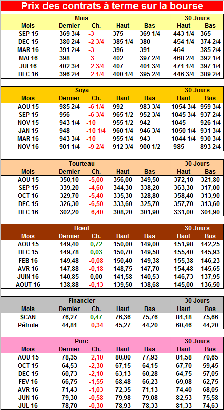 Le prix des contrats de porc a fortement baissé aujourd’hui en raison d’une anticipation de baisse du prix de la découpe prochainement. Les exportations de porcs du mois de juin ont montré que le volume en direction de la Chine a baissé de 4.8%. Je pense que le marché a été déçu de ne pas voir une augmentation.