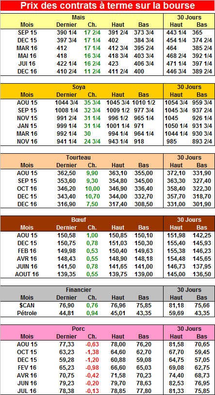 Hausse de 17 cents du prix du maïs aujourd’hui. Le manque de précipitation en Europe et dans la région de la Mer Noire va probablement faire diminuer fortement les rendements puisque la qualité des récoltes est en forte baisse. Le marché, tel que discuté la semaine dernière, était selon moi trop bas et un rajustement à la hausse des prix était à prévoir. De plus, les inventaires de la USDA vont probablement baisser d’avantage dans le rapport de mercredi supportant ainsi les prix.