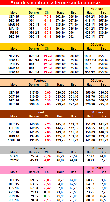 · Les abattages de porcs au cours des 11 dernières semaines ont été de 10 à 13% supérieurs à l’année dernière et selon la firme de recherche « Hightower » le prix des contrats va avoir de la difficulté à monter d’avantage. La Chine pourrait faire monter les prix d’avantage en haussant massivement leurs importations, mais pour l’instant, rien n’est encore joué.