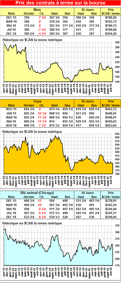 · La USDA anticipe maintenant des inventaires de maïs à 1.760 milliard de boisseaux donc 199 millions de boisseaux de plus que le mois dernier. L’agence américaine a baissé de 50 millions ses estimés pour les exportations et de 75 millions la consommation pour l’éthanol. Le rendement anticipé est maintenant de 169.3 boisseaux à l’acre comparativement à 168.0 le mois dernier. Par conséquent, la production est maintenant prévue à 13.65 milliards de boisseaux (99 millions de boisseaux de plus que dans le dernier rapport).
