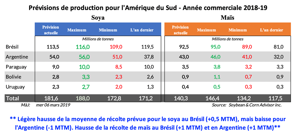 La plupart des zones de production dans le centre ont reçu de bonnes averses la semaine dernière alors que le soya était au stade du remplissage des gousses. Par conséquent, les agriculteurs de la région s’attendent à des rendements de soya supérieurs à la moyenne des 5 dernières années de 8 à 10 %. En revanche, la semaine dernière, les secteurs de production du sud-est sont demeurés principalement secs avec des précipitations limitées dans les prévisions. Les gelées de la semaine passée se sont également produites dans les régions sèches du sud-ouest.