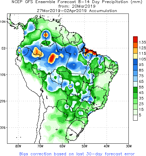 La récolte de maïs safrinha commence bien et les agriculteurs sont optimistes quant à leurs perspectives de récolte. J’ai augmenté mon estimation de maïs brésilien la semaine dernière et je pensais pouvoir l’augmenter de nouveau cette semaine, mais j’ai décidé de m’arrêter compte tenu des prévisions à long terme pour le mois d’avril. Les météorologues brésiliens prévoient un mois d’avril plus sec que la normale dans le centre du Brésil. Si cela se vérifie, cela pourrait poser problème pour le maïs safrinha tardif. Par conséquent, j’ai décidé de laisser mon estimation de maïs brésilien inchangée cette semaine à 93,5 millions de tonnes avec une tendance neutre à élevée.