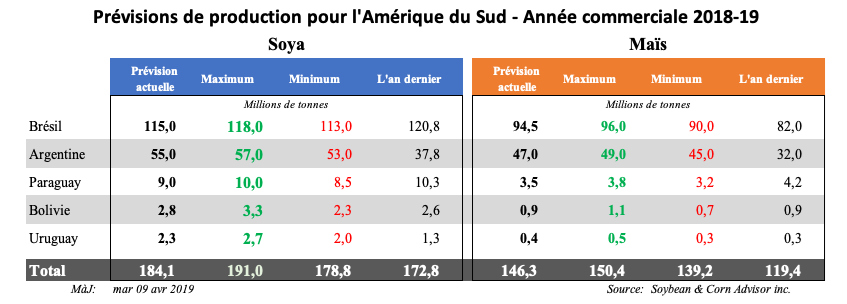 Pour le soya, la récolte de sud-américaine 2018/2019 sera d’environ 11,3 millions de tonnes supérieures à celle de 2017/2018 (184,1 millions de tonnes produites en 2018/2019 comparativement à 172,8 millions de tonnes en 2017/2018), ce qui représenterait une augmentation de 5,9 %. Les estimations de la production peuvent changer quelque peu avant la fin de la saison de croissance, mais la vue d’ensemble restera inchangée. En outre, contrairement à celle de soya, la production de maïs en Amérique du Sud a augmenté plus rapidement en 2018/2019.