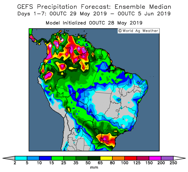 Au Paraná, le Département de l’économie rurale (DERAL) a indiqué que la semaine dernière, 3 % du maïs safrinha avait été récolté et que 28 % d’entre eux mûrissaient, que 60 % étaient au remplissage des grain et que 11 % étaient en pollinisation. La récole est considérée comme «pauvre» à 3 %, «moyenne» à 13 % et «bonne» à 84 %. La production de maïs au Paraná devrait représenter environ 17 % de la production totale de maïs du Brésil. Du gel léger s’est produit durant le week-end dans le sud du Paraná, mais les dégâts pour le maïs safrinha devraient être limités.