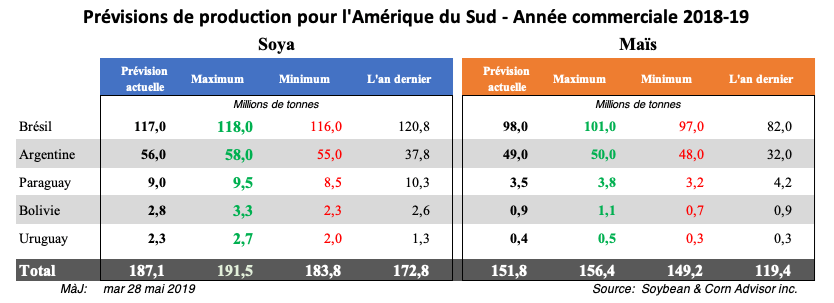 La récolte hâtive de maïs safrinha débute tout juste avec seulement quelques pourcentages des semis récoltés. De nombreux agriculteurs s’attendent à des rendements de maïs supérieurs à ceux de 2016/2017, l’année de la dernière récolte de maïs record au Brésil. Reuters a récemment interrogé 11 analystes au Brésil et l’estimation moyenne de la production de maïs brésilien 2018/2019 est de 97,5 millions de tonnes.