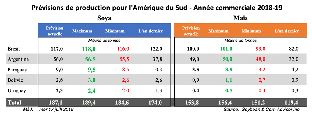 Dans l’État de Paraná, vers la fin de la semaine dernière, le maïs safrinha était récolté à 60 %. Le Département d’économie rurale du Paraná (DERAL) a indiqué que le maïs était au remplissage des grains à 15 % et que 85 % de celui-ci était mature au moment où un gel très élevé a frappé la région dans la nuit du 6 juillet dernier. Le gel aurait pu raccourcir le processus de remplissage des grains du maïs hâtif, mais nous ne le saurons pas avant que les moissonneuses-batteuses ne commencent à récolter. Par conséquent, je suis un peu plus prudent concernant la production de maïs safrinha du Paraná.