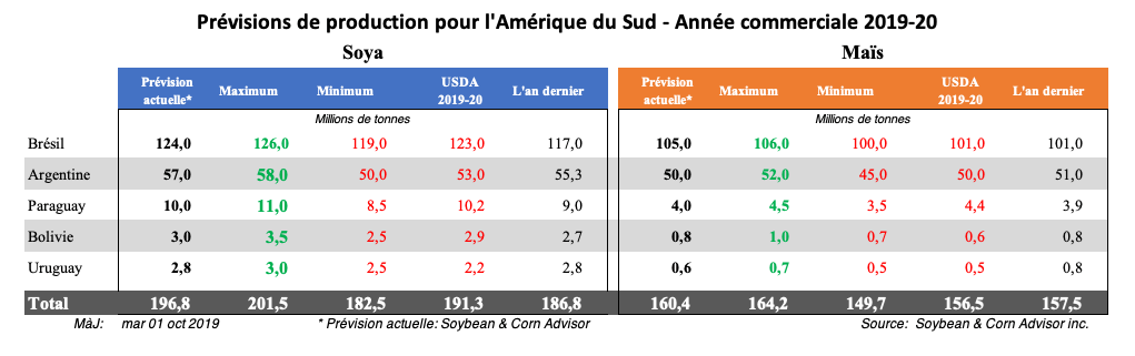 Lors de la conférence annuelle qui a eu lieu la semaine dernière sur la production de cultures d’été 2019/2020 en Argentine, le Buenos Aires Grain Exchange a estimé que la production de maïs 2019/2020 serait de 50 millions de tonnes, soit au niveau similaire à celui de l’année dernière. Pour le soya, il a estimé que la production 2019/2020 est de 51 millions de tonnes, ce qui serait une baisse par rapport à l’année dernière, où il évaluait que l’Argentine en avait produit 55,1 millions de tonnes.