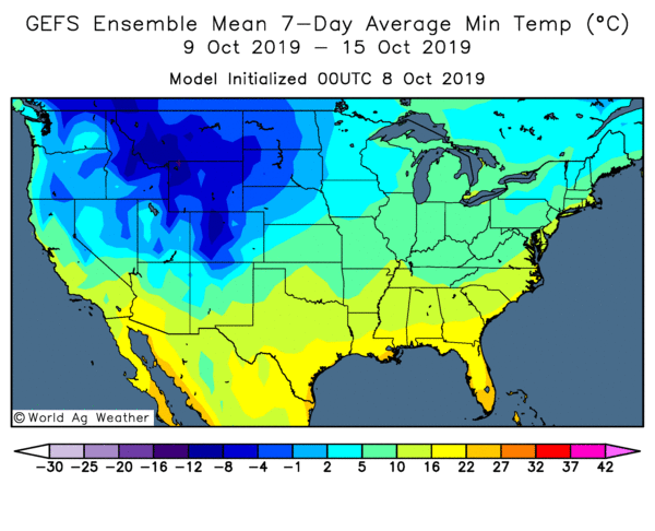 Soya américain 2019 - Un gel glacial est prévu dans l’ouest et le nord-ouest du Corn Belt plus tard cette semaine, ce qui causera probablement des dommages au soya tardif. Les conditions froides et humides dans les régions du centre-nord et du nord-ouest ainsi que les conditions chaudes et sèches pour les régions du sud et du sud-est ne sont d'aucune aide pour le soya. Les conditions humides persistantes pourraient entraîner des problèmes de qualité et une réduction des rendements. Les conditions chaudes et sèches dans les régions du sud mettraient fin prématurément à la saison de croissance, en particulier pour le soya tardif.