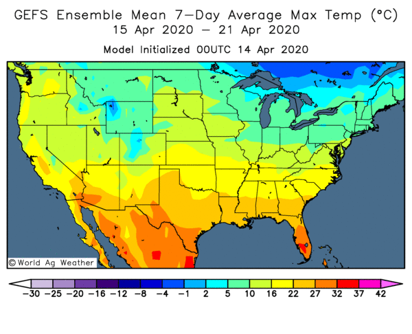 Nous devons surveiller la météo, mais je ne suis pas trop préoccupé par les retards de plantation, du moins pas encore. Les agriculteurs américains peuvent planter environ la moitié de la récolte de maïs avec sept bons jours d’ensemencement. Le maïs américain atteint généralement 50% des semis entre le 7 et le 10 mai.