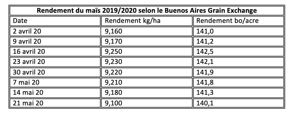 Selon le BAGE, le rendement courant de maïs la semaine dernière était de 9 100 kg / ha (140,1 boisseaux / acre), soit 1,2 boisseaux / acre de moins que la semaine précédente. Il a laissé inchangé son estimation de maïs pour l'Argentine 2019/20 à 50,0 millions de tonnes.