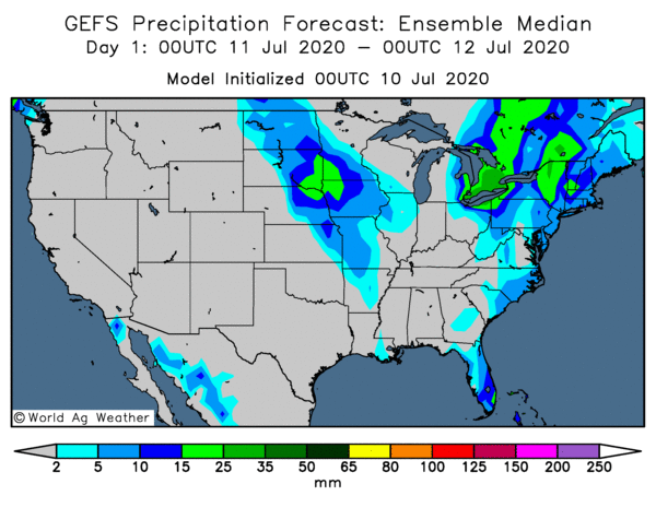 Stress hydrique et développement des gousses de soya – Un mouvement de haute pression sur le Midwest a entraîné des conditions plus chaudes et plus sèches. À ce stade de la saison de croissance, le soya n'est pas aussi sensible aux conditions chaudes et sèches que le maïs. Le maïs n'a qu'une seule chance de développer et de polliniser les épis, tandis que le soya a de multiples chances de remplir les gousses et de les développer. Si les conditions chaudes et sèches persistent pendant une période de temps prolongée, cela pourrait entraîner un retard de croissance du soya avec un potentiel de rendement inférieur.