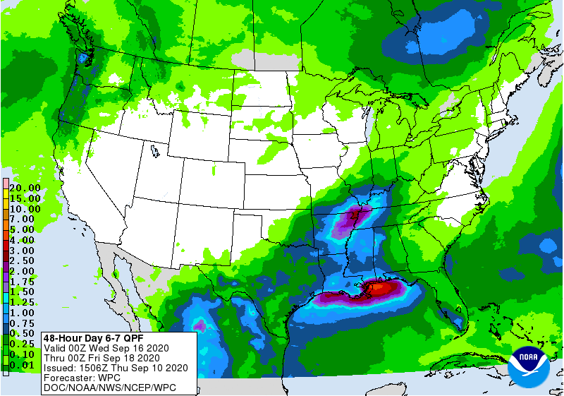 Le soya est à 20% en perte des feuilles, contre 7% l'an dernier et 16% pour la moyenne des 5 dernières années. Avec 20% en perte des feuilles, cela signifie qu'environ 45% des graines de soya jaunissent. Les pluies qui se produisent dans le Midwest cette semaine pourraient aider certains des plants de soya à maturation tardive. Je ne pense pas qu'ils ajouteront des boisseaux à la récolte de soya, mais ils pourraient plutôt aider la culture à maintenir son potentiel de rendement actuel.
