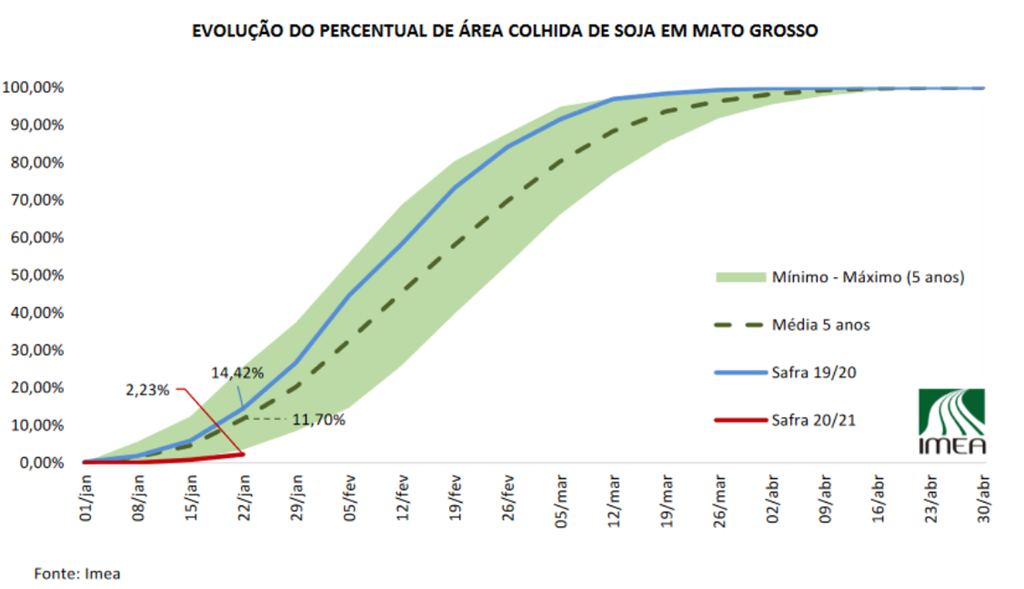 Vous trouverez ci-dessous le graphique de l'Institut d'économie agricole du Mato Grosso (Imea) montrant le rythme de récolte du soya dans le Mato Grosso. La ligne rouge est 2020/21, la ligne bleue est 2019/20, la ligne pointillée est la moyenne et la zone verte est le maximum et le minimum au cours des 5 dernières années.
