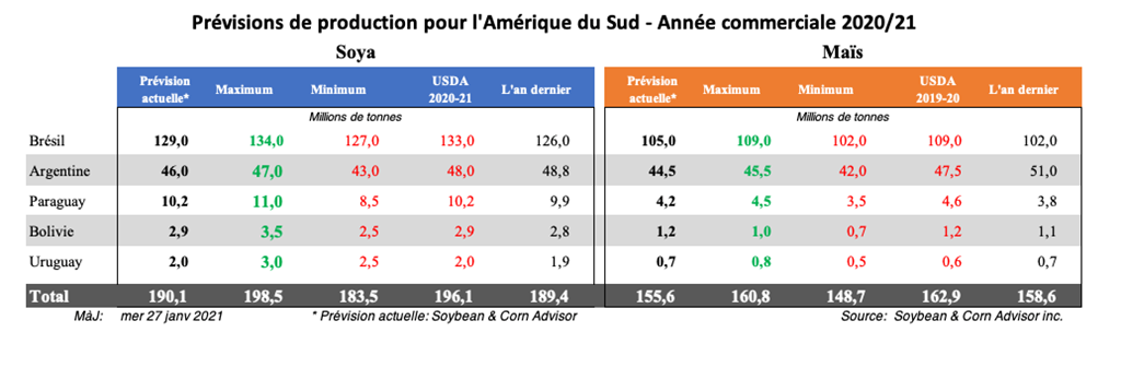 Bien que le temps n'ait pas été parfait, les pluies récentes ont été suffisamment bonnes pour améliorer l'humidité du sol et la cote de l'état du maïs. Certains des premiers plants maïs semés ont subi des pertes de rendement en raison du temps sec en décembre, mais le taux d'humidité est maintenant meilleur pour le maïs à maturation tardif. Les prévisions prévoient plus de précipitations dans les régions du nord et des quantités légères dans les régions du sud et je considère que le temps récent est assez bon pour stabiliser la récolte dans le centre et le nord de l'Argentine, mais moins qu'idéal dans les régions plus au sud.