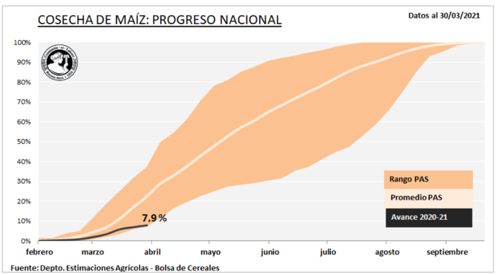 Ci-dessous, un graphique de la Bourse des Grains de Buenos Aires montre le «progrès national de la récolte du maïs». La zone de bronzage est la plage de récolte maximale et minimale et la ligne noire est la progression de la récolte pour 2020/21. La saison de croissance du maïs est très étendue en Argentine avec des semis allant de septembre à janvier et des récoltes allant de février à septembre. La récolte de maïs en Argentine atteint généralement 50% vers la mi-mai.