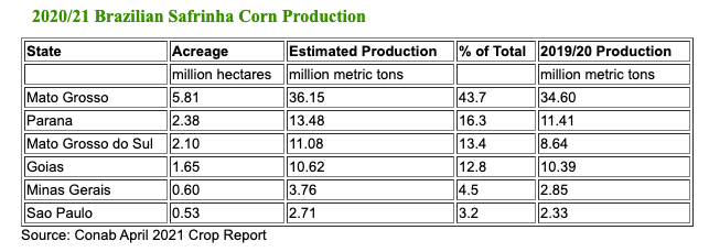 Le tableau ci-dessous est l'estimation d'avril de Conab pour la production brésilienne de maïs safrinha 2020/21.