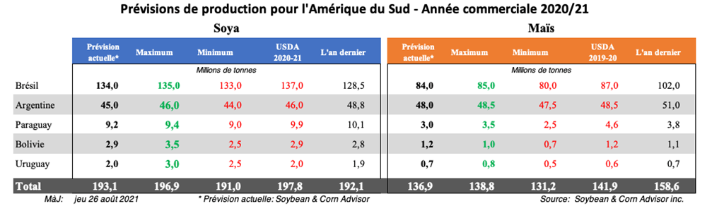 Les agriculteurs brésiliens devraient profiter des prix élevés du soya sur le marché intérieur et augmenter leur superficie de soya de 4 à 5 % pour atteindre 40,5 millions d'hectares (100 millions d'acres). Si la météo coopère, et c'est un pari de taille à ce stade, la production de soya brésilienne 2021/22 devrait être de l'ordre de 143 à 145 millions de tonnes. Si ceci est vérifié, cela représenterait 6 à 8 millions de tonnes de plus que l'estimation actuelle de l'USDA de 137 millions de tonnes pour la récolte 2020/21.