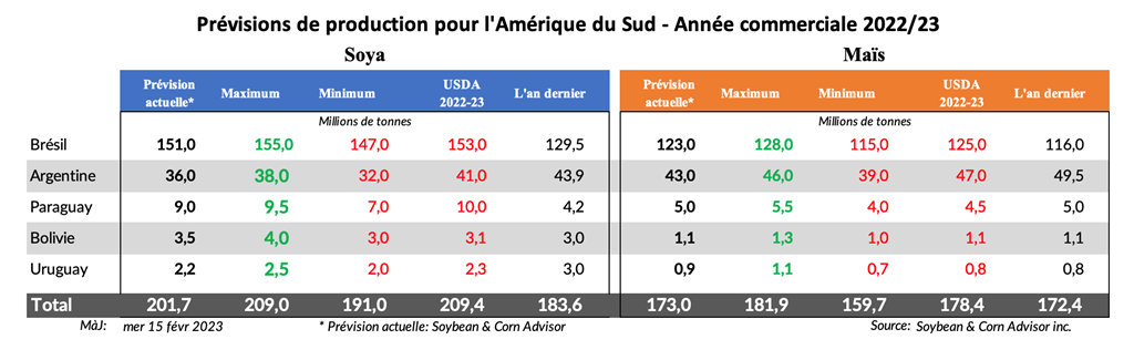 Conab a augmenté son estimation de soya brésilien 2022/23 de 0,17 million de tonnes la semaine dernière à 152,82 millions de tonnes. L'USDA a laissé son estimation du soya brésilien 2022/23 inchangée la semaine dernière à 153,0 millions de tonnes.