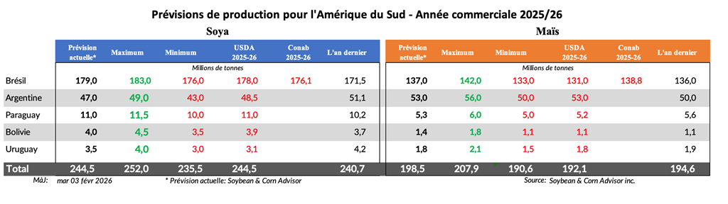 La plupart des estimations privées de la production brésilienne de soja 2025/26 ont augmenté ces dernières semaines en raison de bons rendements en début de récolte. Les estimations vont d’un creux de 177 millions de tonnes à un sommet de 183 millions. AgRural a relevé son estimation de soja de 0,6 million de tonnes par rapport au mois dernier, à 181,0 millions.