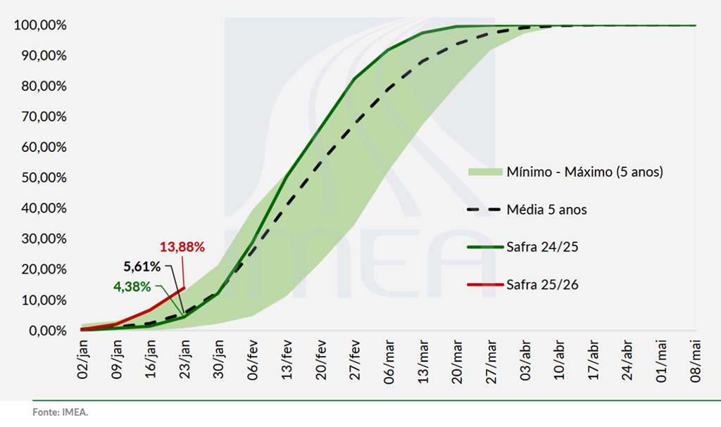Mato Grosso – Au Mato Grosso, 13,8 % du soja était récolté à la fin de la semaine dernière, contre 4,3 % l’an dernier et une moyenne de 5,6 %. Cela représente une progression de 7 % sur la semaine. La récolte la plus avancée se trouve dans la région du centre-nord, où 22 % du soja a été récolté. La plupart des producteurs continuent de signaler de bons rendements en début de récolte. Ci-dessous, l’état d’avancement de la récolte de soja au Mato Grosso au 23 janvier 2026, selon l’Institut d’économie agroalimentaire du Mato Grosso (Imea).
