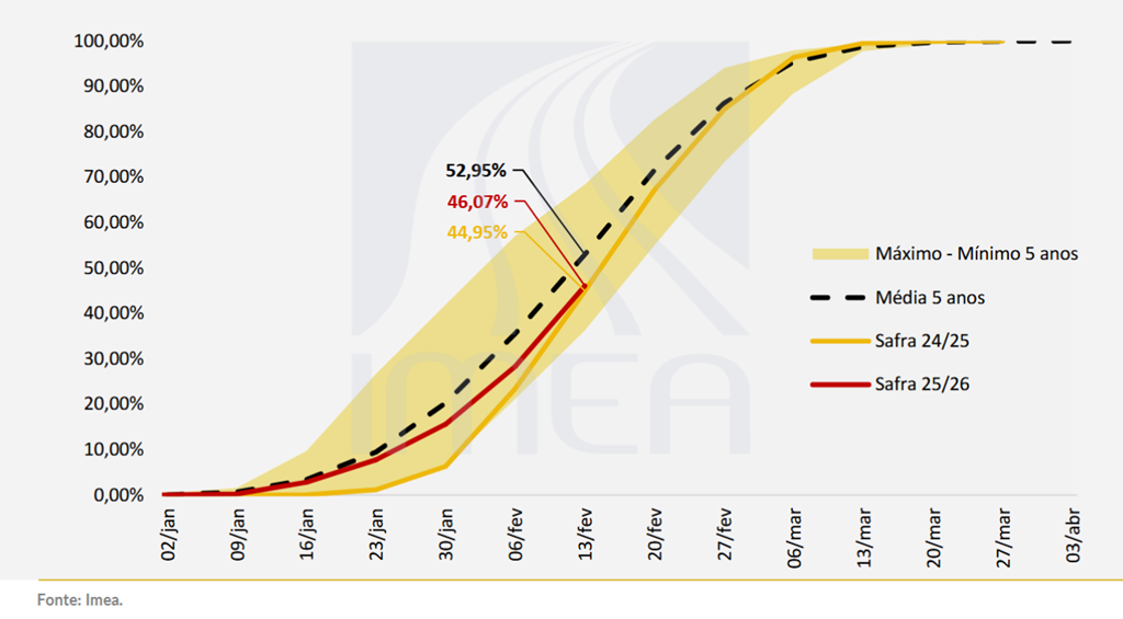 Mato Grosso – Le maïs safrinha au Mato Grosso était semé à 46 % à la fin de la semaine dernière, contre 45 % l’an dernier et une moyenne de 53 %. Cela représente une progression de 17,7 % sur la semaine. Les semis sont les plus avancés dans la région du médio-nord, où 62 % du maïs a été semé. Ils sont les plus en retard dans la région du sud-est, où 22 % a été semé. Ci-dessous, l’état d’avancement des semis de maïs safrinha au Mato Grosso au 13 février 2026, selon l’Imea.