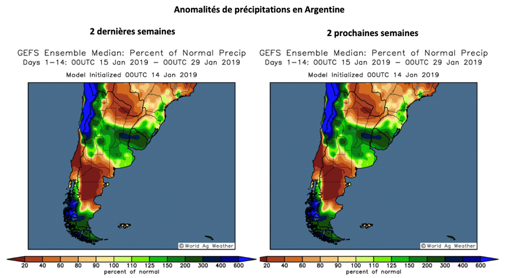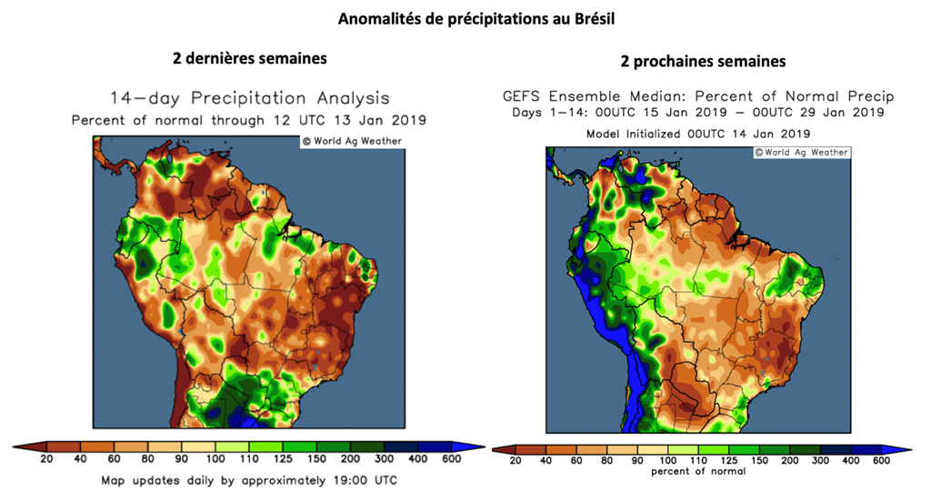 Dans les régions les plus durement affectées par la mauvaise météo, les producteurs commencent maintenant à mettre leurs espoirs sur la production de maïs safrinha (2e récolte en maïs). Mais, il demeure à voir si la météo voudra collaborer au cours de la saison de croissance de safrinha. La période la plus critique pour le maïs safrinha sera de la mi-mars à la mi-mai lorsque les cultures vont en être au stade de la pollinisation et du remplissage des grains.