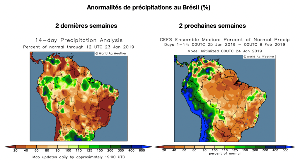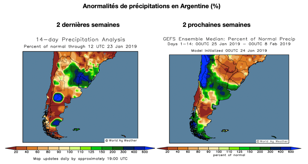 Les fortes pluies au nord de l’Argentine ont empêché les producteurs dans les provinces de Chaco, Santiago del Estero et au nord de Santa Fe d’ensemencer leur soya. Le Buenos Aires Grain Exchange estime que 200,000 hectares de soya ont été perdus ou non-ensemencés à cause des conditions saturées. Par conséquent, il a abaissé son estimé des superficies allouées à la production de soya 2018/2019 à 17,7 millions d’hectares, un résultat similaire à l’an passé.