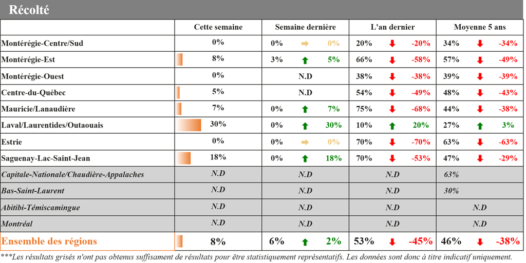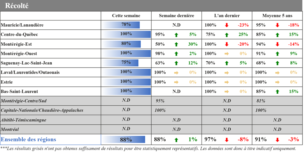 Pas de grande avancée dans les récoltes cette semaine, mais nos répondants ont tout de même pris le temps de nous partager leurs premières impressions sur les rendements dans le maïs et l’humidité du grain, alors que les récoltes débutent tranquillement dans plusieurs régions.