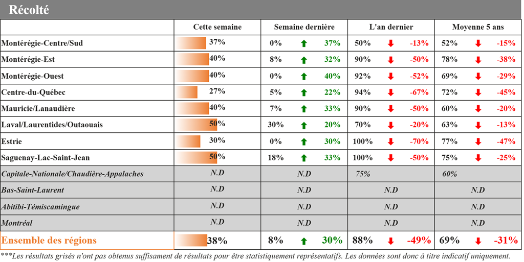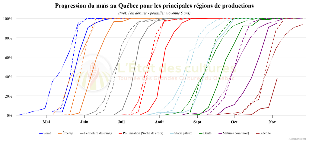 Avec près de la moitié des superficies de maïs-grain récoltées, les rendements s’avèrent finalement meilleurs qu’attendus pour la majorité des producteurs. Le taux d’humidité, quoique très variable, a tendance à être encore élevé.