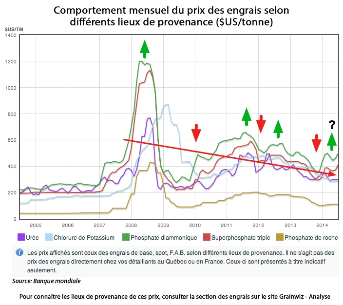 Pourtant, le prix moyen record des engrais a plutôt eu lieu en 2008, suivi d’un second sommet plus modéré en 2011, et encore plus faible en 2012. En fait, on peut même se demander si l’un et l’autre ne suivent pas une trajectoire opposée, puisque le maïs a suivi une tendance continuelle à la hausse jusqu’à cette année (2014), alors que ce semble être l’opposé pour le prix des engrais qui n’ont cessé de suivre une trajectoire progressivement à la baisse depuis 2008.
