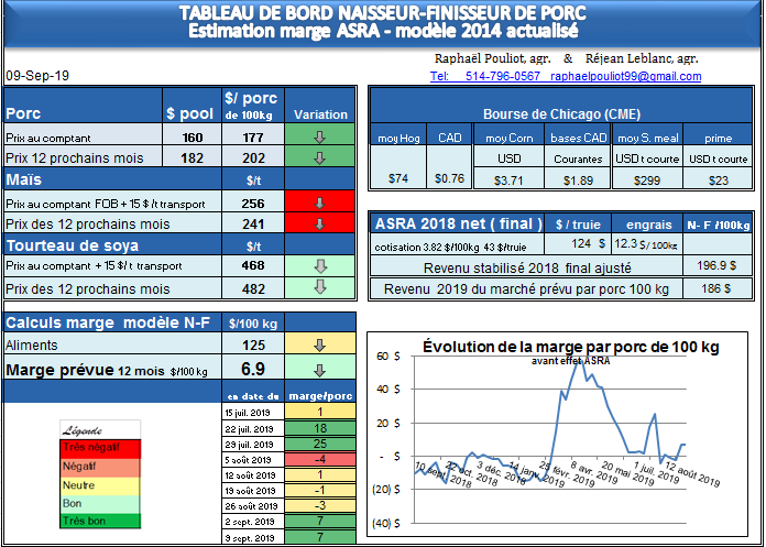 Malgré certains signes positifs sur les exportations, les incertitudes demeurent en ce qui concerne la Chine, mais le potentiel d’une hausse à terme est toujours là. La marge par porc à + 7 $ est intéressante dans une perspective historique. Pour certains d’entre vous, il pourrait être intéressant de prendre une première tranche sur les mois d’été 2020. Pour ce qui est des grains, tranquillement le tourteau se place dans des zones intéressantes. Pour ce qui est du maïs, malgré des prix de contrats bas à Chicago, celui-ci à cause des bases demeurent élevé au Québec. Il faut donc attendre la récolte avant de se positionner.