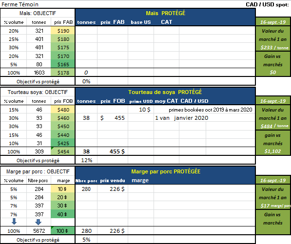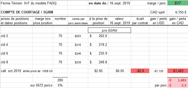 La marge est présentement pour les 12 prochains mois de  17 $  par porc au-dessus du prix stabilisé ASRA ;  suite à deux belles journées de limit up et M. Trump qui semble vouloir enterrer la hache de guerre ( un peu ),   les revenus de vente sont de 215$ par 100 kg 1 an;   la ferme Témoin de 5672 porcs vendus par an n’a présentement aucune position de porc,   elle déclenche donc à raison de 5% de son volume annuel,  positions de février à août 2020,   soit 280 porcs,   70 porcs par contrat  répartis sur 4 contrats  ( cld 2,   4 ,   6   et 8 ).    Pour le contrat de décembre 2019,  il manque quelques dollars pour atteindre son objectif,   basé sur l’historique des écarts entre les différents contrats de Lean hog,  ramené sur l’objectif de protéger une marge équivalent à plus de 10$ par porc au-dessus du prix stabilisé.