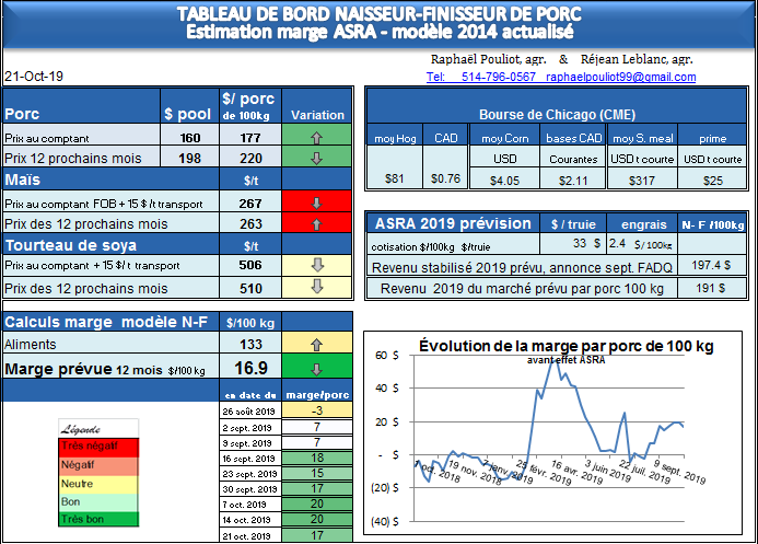 Lundi 21 octobre ( avant l’ouverture des marchés ce matin ), la marge de la ferme naisseur-finisseur ASRA est de 17$ au-dessus du prix stabilisé pour les 12 mois à venir ( des revenus de 220 $ par porc de 100 kg ) . Légère hausse des hogs aujourd’hui.