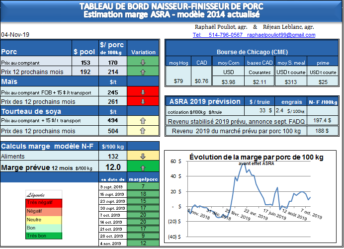 Le prix du porc la semaine dernière a de nouveau oscillé à la hausse et à la baisse pour finir en moyenne plus élevé, surtout à cause des contrats éloignés. La baisse de valeur de notre devise a aussi contribué à cette hausse moyenne. Depuis le début septembre, la marge moyenne 1 an est à 15 $/porc. Avec la hausse du volume de production, tout repose sur les exportations américaines pour soutenir ces prix. Plusieurs d’entre vous avaient déjà des positions pour le premier trimestre, des positions prises en partie au printemps dernier et en septembre. Ce premier trimestre devrait dégager des marges positives. Il faut regarder maintenant les autres trimestres pour au moins avoir un volume de protégé.