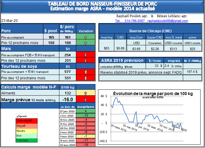 Nous sommes dans des zones inconnues, il est alors difficile de prévoir ce qui va arriver. Les fondamentaux ne changent pas, la production américaine est importante, ce qui devrait influencer négativement les prix. À l’inverse, la situation de la peste porcine en Chine et autre pays en Asie n’est pas réglé. Cela devrait avoir un effet positif sur les marchés. Pour ce qui est des grains, le volume est là et c’est plus la situation de l’éthanol qui influence négativement les prix. Finalement, le dollar canadien est malmené et en forte baisse.