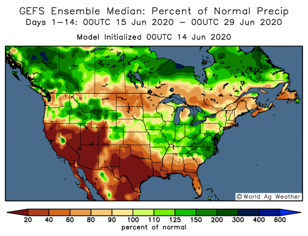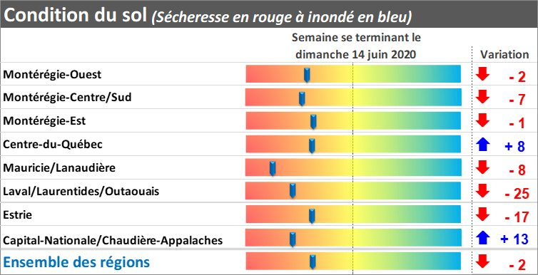 Le principal enjeu est les conditions très sèches qui sont à surveiller (Le Québec agricole en important déficit hydrique). Des précipitations sous les normales sont prévues et une autre vague de chaleur au cours des deux prochaines semaines au Québec.