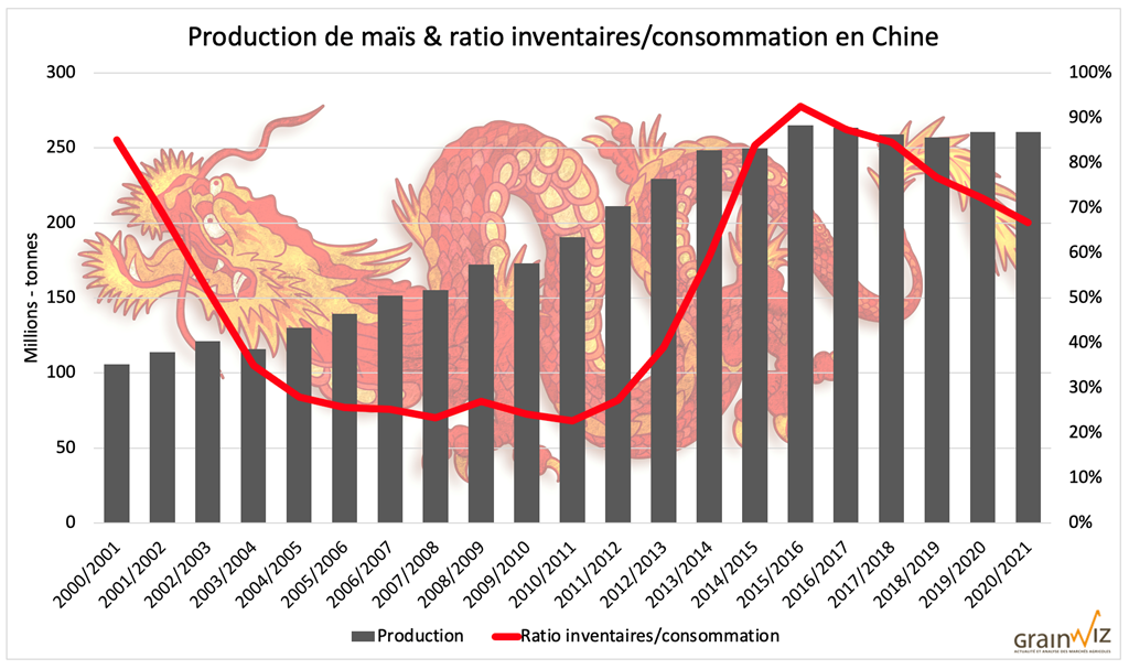 Selon les derniers chiffres du USDA, les récoltes chinoises de maïs plafonnent depuis déjà 6 ans à plus de 250 millions de tonnes. Pendant ce temps, leurs inventaires s’amincissent alors que la demande reste vigoureuse. Résultat, le fameux ratio inventaires/consommation est en recul depuis 6 ans.
