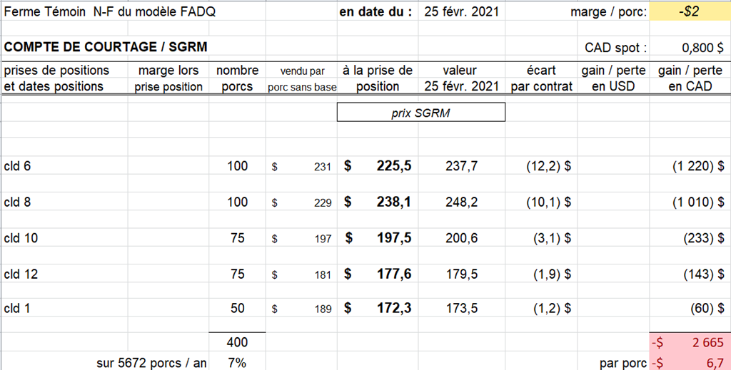 Ferme Témoin de 5672 porcs produits par an donne de nouveaux ordres ouverts au SGRM, sur 225 porcs supplémentaires sur les cld 6, 8 et 10 ; elle possède présentement 400 porcs placés soit 7% de sa production. Depuis quelques jours les hogs ont augmenté fortement, surtout les positions rapprochés, les revenus sur les 12 prochains mois sont de 217$ par porc de 100 kg, soit presque une marge nette à l’équilibre pour l’année à venir malgré le maïs à 300$ la tonne ( et malgré le dollar canadien qui vient d’atteindre 0.80 …. ) . Les découpes de l’été 2021 ont franchi les 100 $ US, les hog d’été dans les 95 $ US , ce qui représente 240 $ par porc de 100 kg pour juin à août 2021, de bons prix de déclenchement.