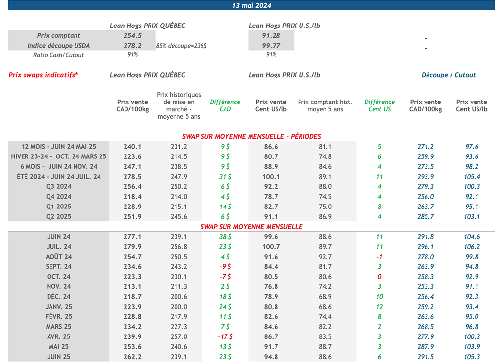 • La semaine dernière, les contrats à terme sur le porc pour les mois de juin et de juillet ont enregistré une légère baisse, clôturant la semaine à 98,375 cents US/livre et 101,45 cents US/livre respectivement, ce qui représente des diminutions de 0,575 cent US/livre et 1,40 cent US/livre.