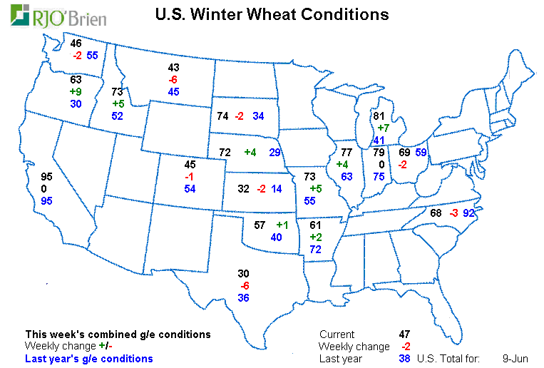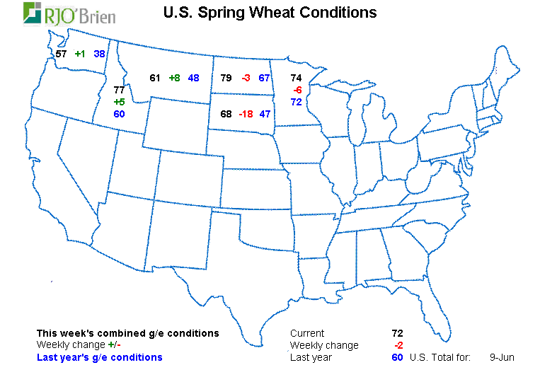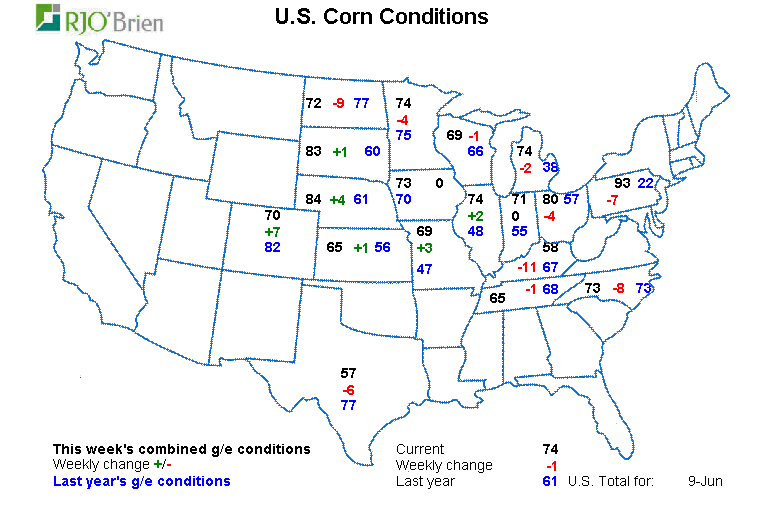 En gros ce qu’l faut retenir c’est que ça va bien. Je note un léger recul dans la condition des cultures mais rien de grave. Tant que ce n’est pas une tendance forte/lourde où on pense que la situation va se détériorer violemment et rapidement, il ne faut pas trop s’en faire. Que la qualité passe de 75% à 74% c’est rien. Mais si on est en plein juillet et que la situation météo s’mêle de la partie et les conditions baissent de 5% à toutes les semaines, là c’est autre chose. Mais en juin, passer de 75% à 74%…. Rien là. Le bulletin de la semaine est très bon quand même! Imaginez-vous le/la première de classe dans l’temps à l’école… y’a toujours un ou une bollé qui pète des scores; toujours des A+ avec 96% de moyenne. Il y a toujours un ou une fatigante comme ça. Un jour c’te personne là est déçue pis nous dit « Ah ma note est moins bonne qu’au dernier quizz… ». Moi j’me rappelle dans l’temps ça me faisait comme plaisir. C’est malin, han? J’étais comme haha kin toé, tu vas arrêter de faire suer avec tes grosse notes! Pour te rendre compte que finalement son 96% est vraiment moins bon… à 92%. Doh! À ce moment-là j’me sentais toujours plus toton avec mon 86% que j’étais fier. M’enfin. J’allais me reprendre au ballon chasseur crois moi. Pas le ballon en mousse. Le ballon en rubber qui sentait fort. Celui qui sonnait creux. Poouuiiannnggg. Je suis certain que tu as le son dans ta tête. C’est fort la mémoire du son et la mémoire olfactive, han? Le ballon rouge. Je sais que tu sais de quoi je parles. Tu l’entends. Tu le sens. Je m’égare. Sorry haha.
