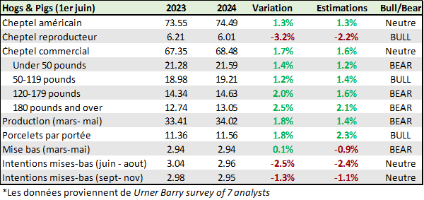 - A la vue des chiffres d’abattages de mai et de juin, on peut clairement souligner le fait que le nombre de porcs a clairement excédé les attentes du marché et le USDA prend note de cette réalité. Le nombre de porcs dans la catégories 180 livres ont dépassé les attentes des analystes. Mais cette situation devrait perdurer encore quelques semaines (+2% plus de porcs).