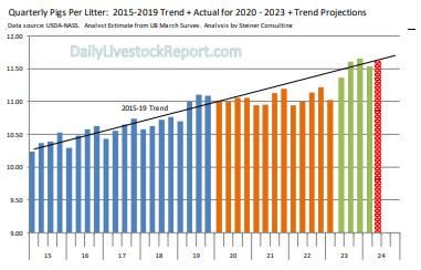 - Le nombre de porcelets par portée a augmenté mais moins rapidement que la dernière année. A-t-on atteint un nouveau plateau? (voir tableau du DailyLivestock report)