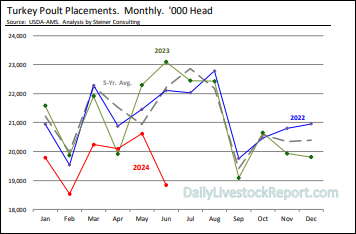 Le Dailylivestock report avait aussi un article intéressant hier. Celui-ci parlait de la baisse drastique de la production de dindes cette année. Les raisons évoquées : la maladie de la grippe aviaire qui a mis à mal la production au cours des deux dernières années et les pertes financières qui se sont trop accumulées et qui ont forcé le retrait de plusieurs producteurs. Les placements sont très bas comparativement aux années précédentes. La baisse de placement en mai était de 7.5% et de 18.4% en juin, soit la plus grande baisse enregistrée depuis 30 ans! Normalement, le temps de Fêtes (Thanksgiving et Noel) devrait apporter une demande pour les produits de la dinde, mais pas à n’importe quel prix. Peut-on croire que la demande de jambon sera plus forte? (produit substitut).