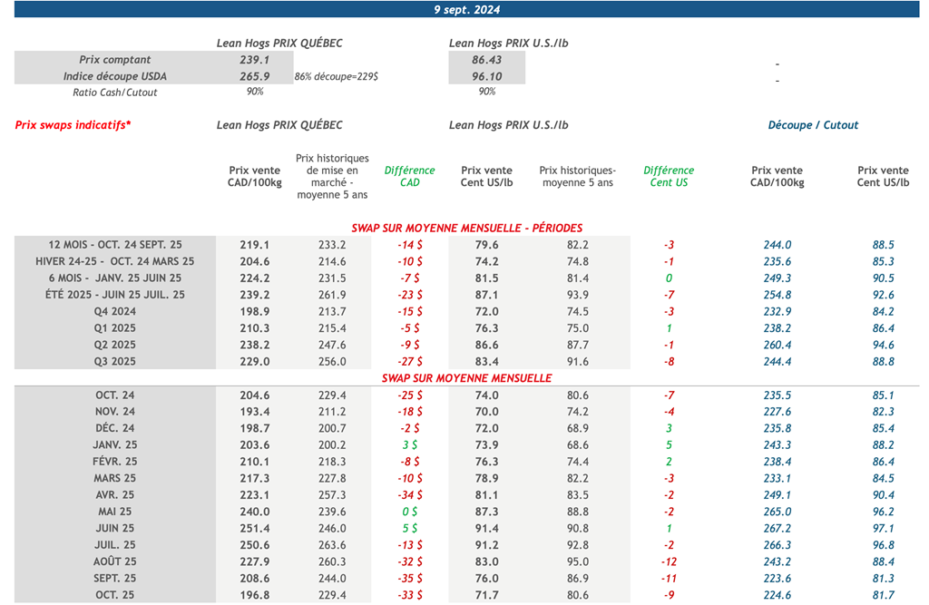 • Les contrats à terme sur le porc ont terminé en ordre dispersé la semaine dernière, les échéances rapprochées terminant en territoire négatif alors que les contrats à plus long-terme finissaient avec de légères hausses. Notamment, le contrat d’octobre-24 a perdu 2,72 cents US/lb sur la semaine pour terminer à 79,50 cents US/lb vendredi.