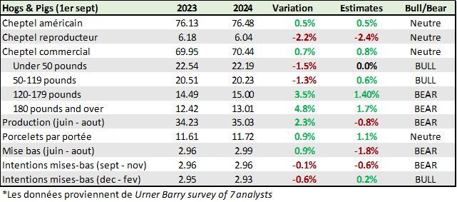 - Que dire du nombre de mises-bas en été! On s’attendait à une réduction de 1.8%, nous avons une augmentation de 0.9% versus les intentions de juin dernier. (mais c’est en baisse versus juin / aout 2023 de 2%) Même chose dans les intentions pour l’automne. Faut croire que la baisse du prix des moulées est venu jouer dans la têtes des producteurs et productrices. La rentabilité était là et l’est encore, alors aussi bien en profiter. Mais tout ca n’est pas clair puisque le USDA a tendance à réviser à la hausse des données de production des mois passés. Pour vous donner un exemple, le USDA a révisé les données de mars en les augmentant de 370 000 porcs, mais en augmentant les inventaires totaux en juin de 725 000 porcs encore! Évidemment si on augmente le nombre de porc passé, le pourcentage d’augmentation devient automatiquement plus petit sur les données de septembre…. Un peu comme l’inflation ces temps-ci. L’augmentation des prix est plus petit, mais les prix augmentent quand même !