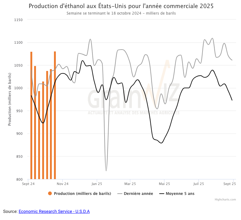 Durant la semaine du 18 octobre dernier, la production moyenne d’éthanol US a été de 1,081 million de barils par jour pour une production totale de 7,567 millions de barils. Il s’agissait en fait d’une augmentation de 3,7 % comparativement à la semaine précédente et d’une hausse de 3,9 % par rapport à l’an passé. 109,06 millions de boisseaux de maïs ont été utilisés dans la fabrication de l’éthanol US.