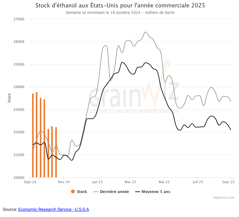 Quant aux inventaires d’éthanol US, ils ont été établis à 22,223 millions de barils, ce qui était une baisse de 0,2 % comparativement à la semaine précédente et une hausse de 3,9 % par rapport à l’an dernier.