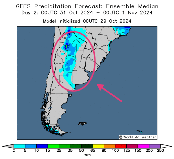 - Globalement, les conditions météo en Argentine sont bonnes. L’analyse des cartes de l’Argentine, fournies par World Ag Weather et dessinées jusqu’au 3ème jour, indique des probabilités de pluie bénéfiques pour la majeure partie des zones de production.